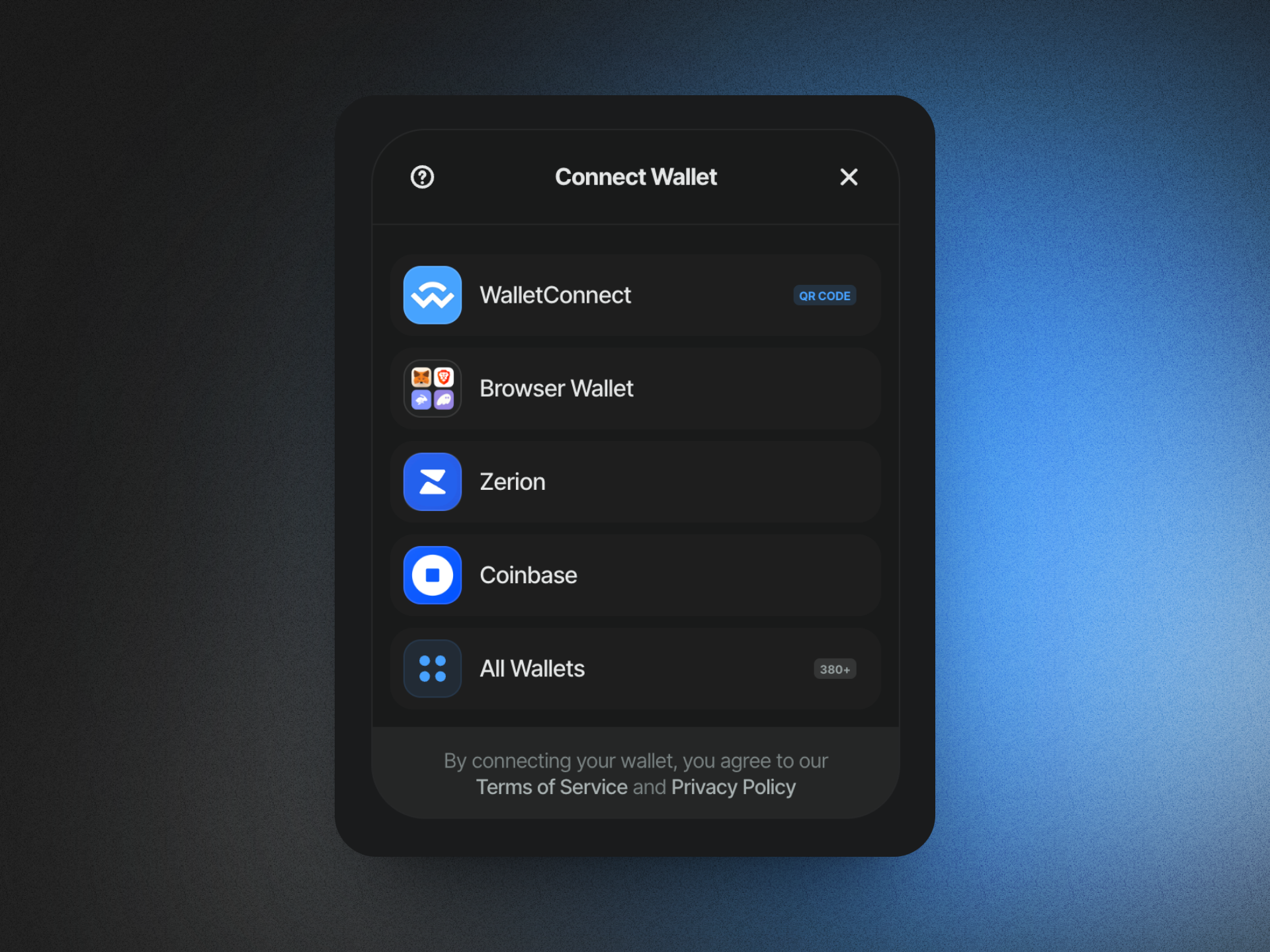 Head over to a AppKit-enabled application and click the "Connect Wallet" button. You will be prompted to connect your wallet.