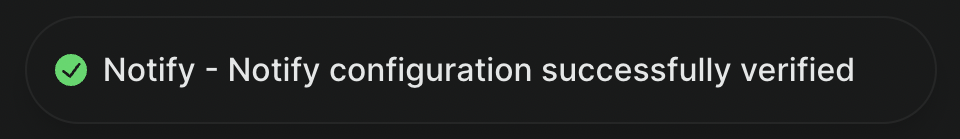 Once all changes have been saved and the did.json file has been deployed successfully, switch on the toggle switch in the Notify API section of your WalletConnect Cloud project. If everything is configured correctly, you should see a success toast: "Notify configuration successfully verified"