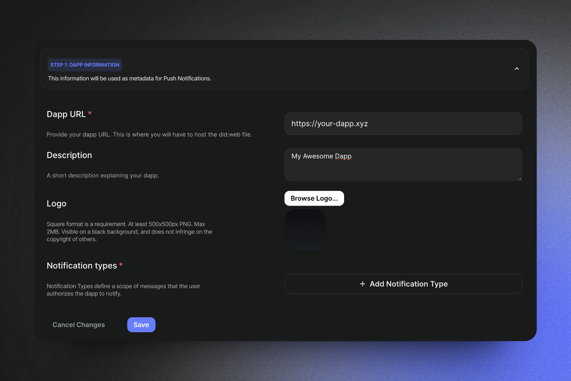 The dapp name, description, and logo are displayed in wallets that integrate Notify API as well as in the Web3Inbox.com app. These details should be provided for the best user experience and to help the user identify your app.