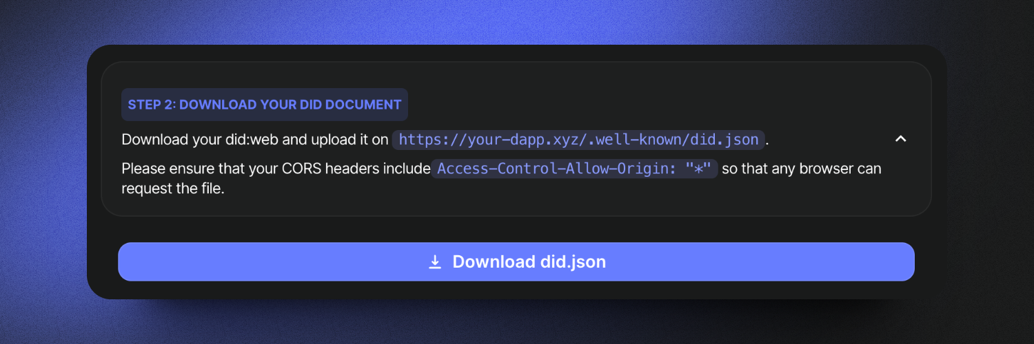 Next, you will need to host did.json file on this page at the /.well-known/ directory of your public URL. Please also ensure that your application has CORS enabled. An example is linked here.