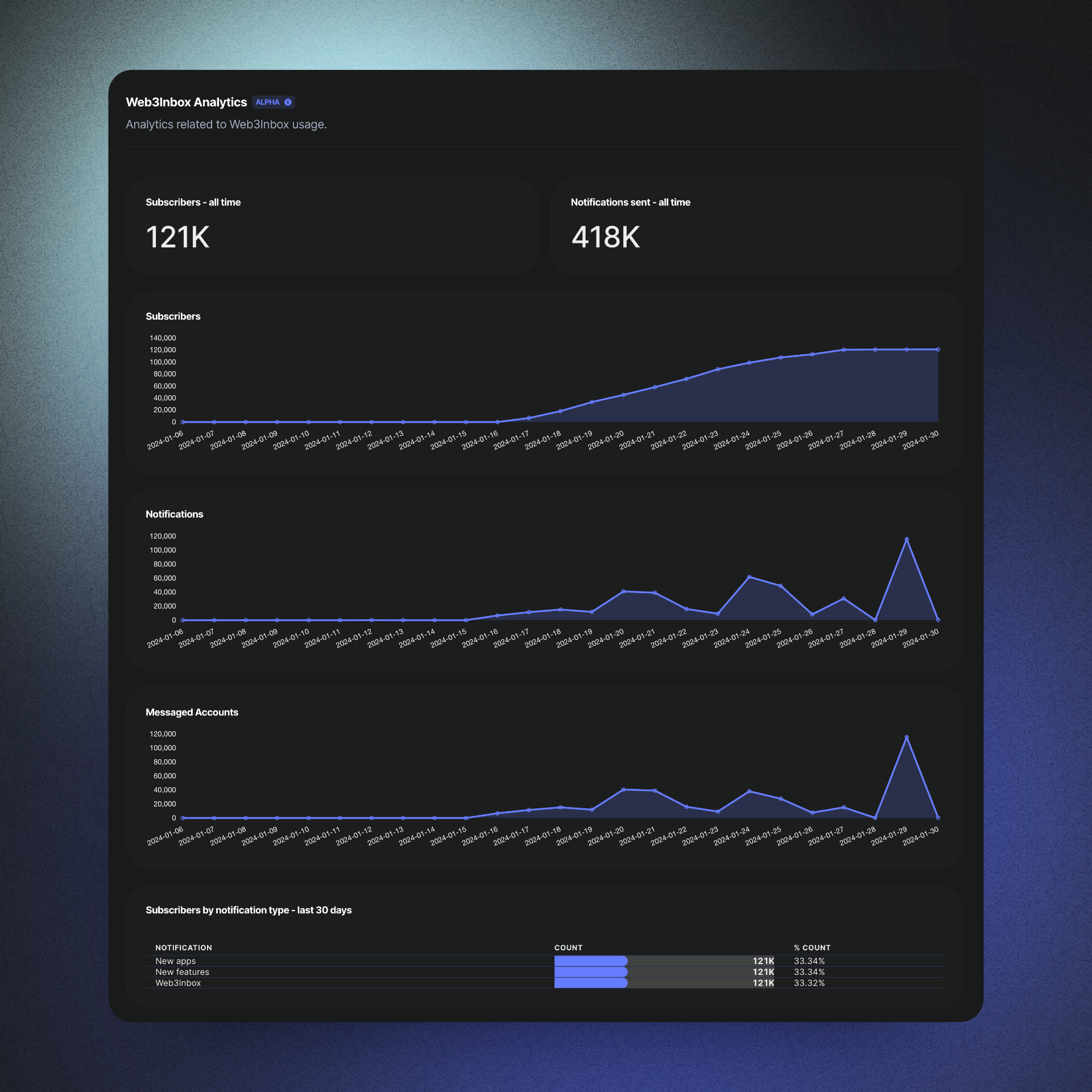 3. Navigate to the Metrics tab and select Web3Inbox from the dropdown to access analytics for your app. Learn more about Web3Inbox Analytics.