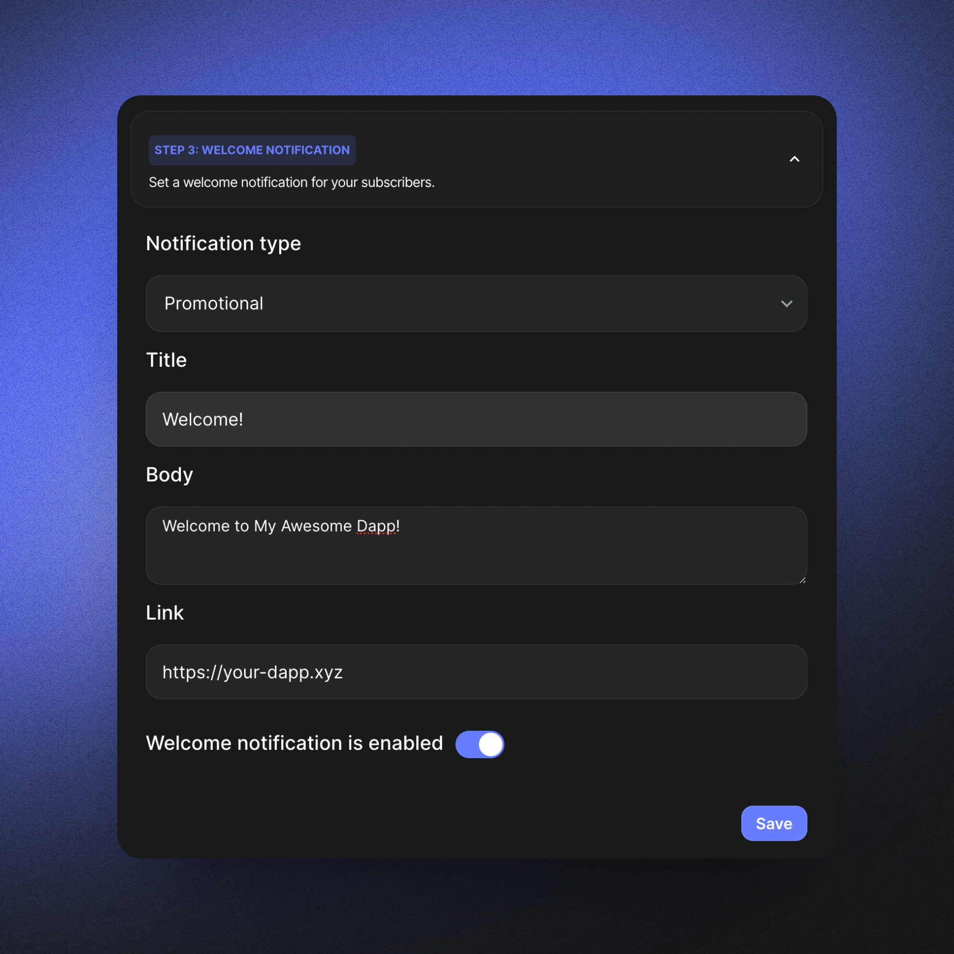 To enable Welcome Notifications, switch on the toggle in the Welcome Notifications section of your WalletConnect Cloud project after adding relevant Notification Type, Title, Body & Link.