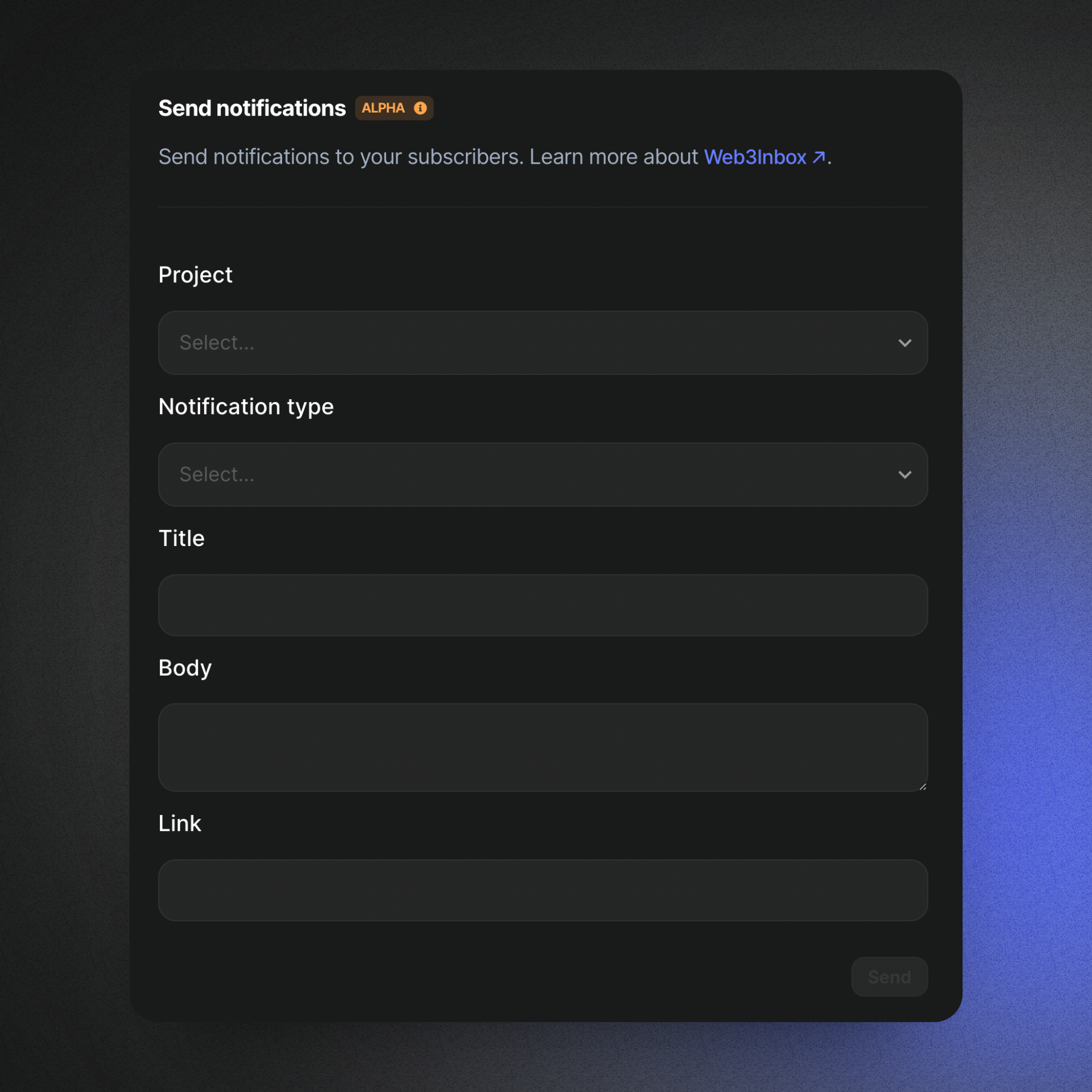 You can send notifications to subscribed users easily in WalletConnect Cloud. Sending to users involves targeting particular notification types who will receive your notification if they have not opted-out. You can specify a title and body for the notification, as well as a call-to-action link which users will be taken to when clicking on the notification.