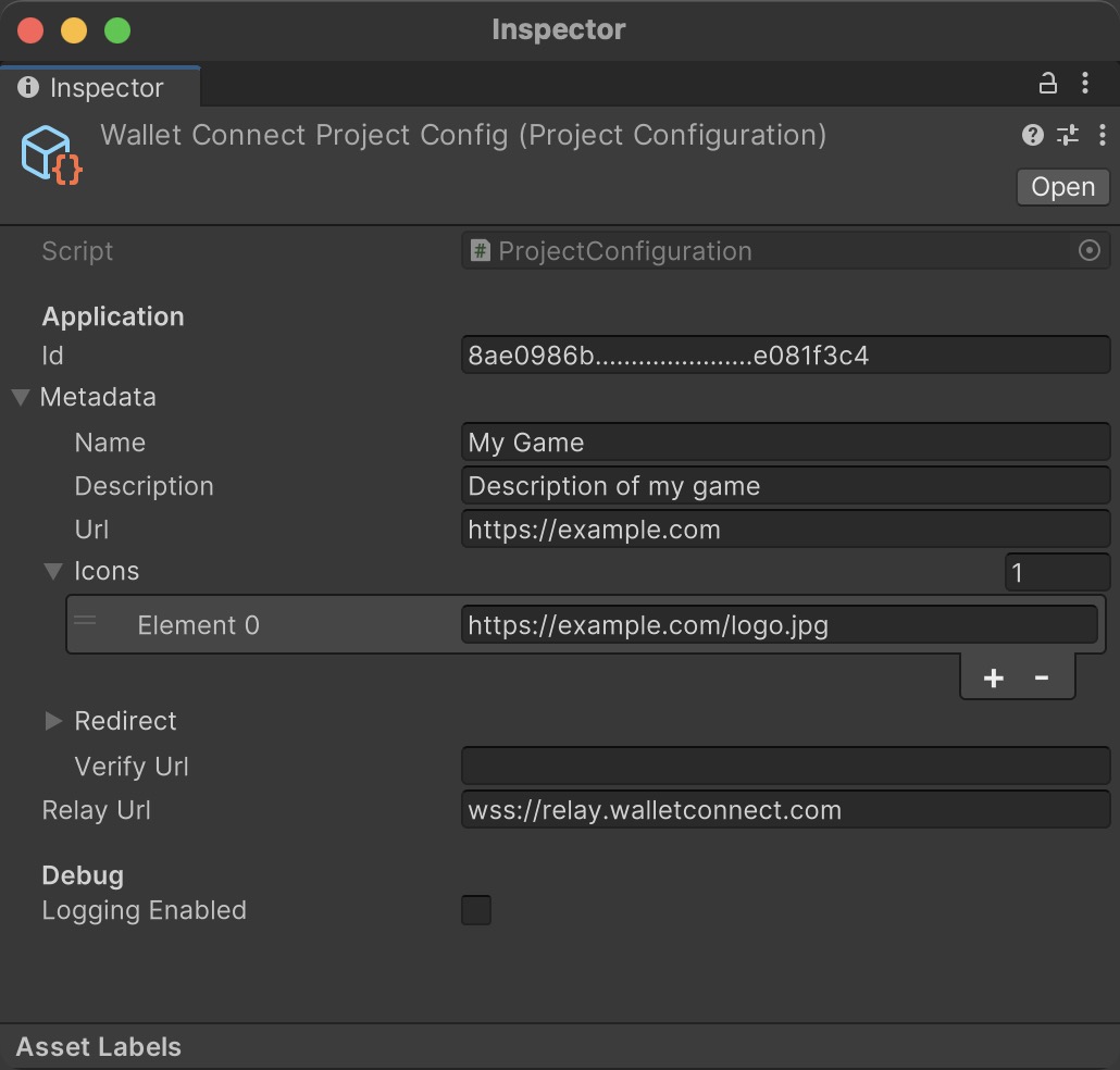 The minimum configuration required is filling in a Project ID and Metadata fields inside of WalletConnectProjectConfig scriptable object. The scriptable object is automatically created after package installation. You can find it in the Assets/WalletConnect/Resources directory.
